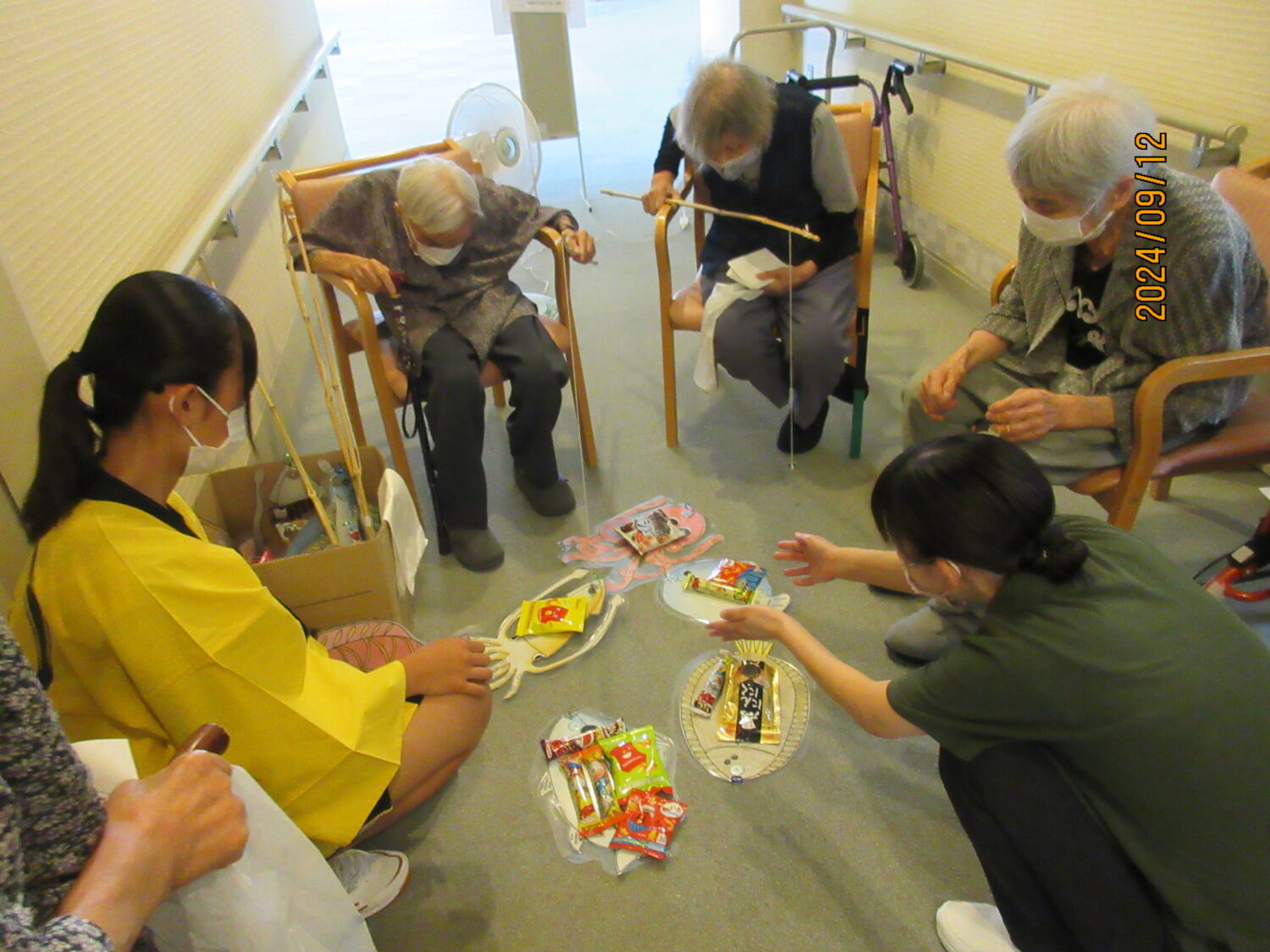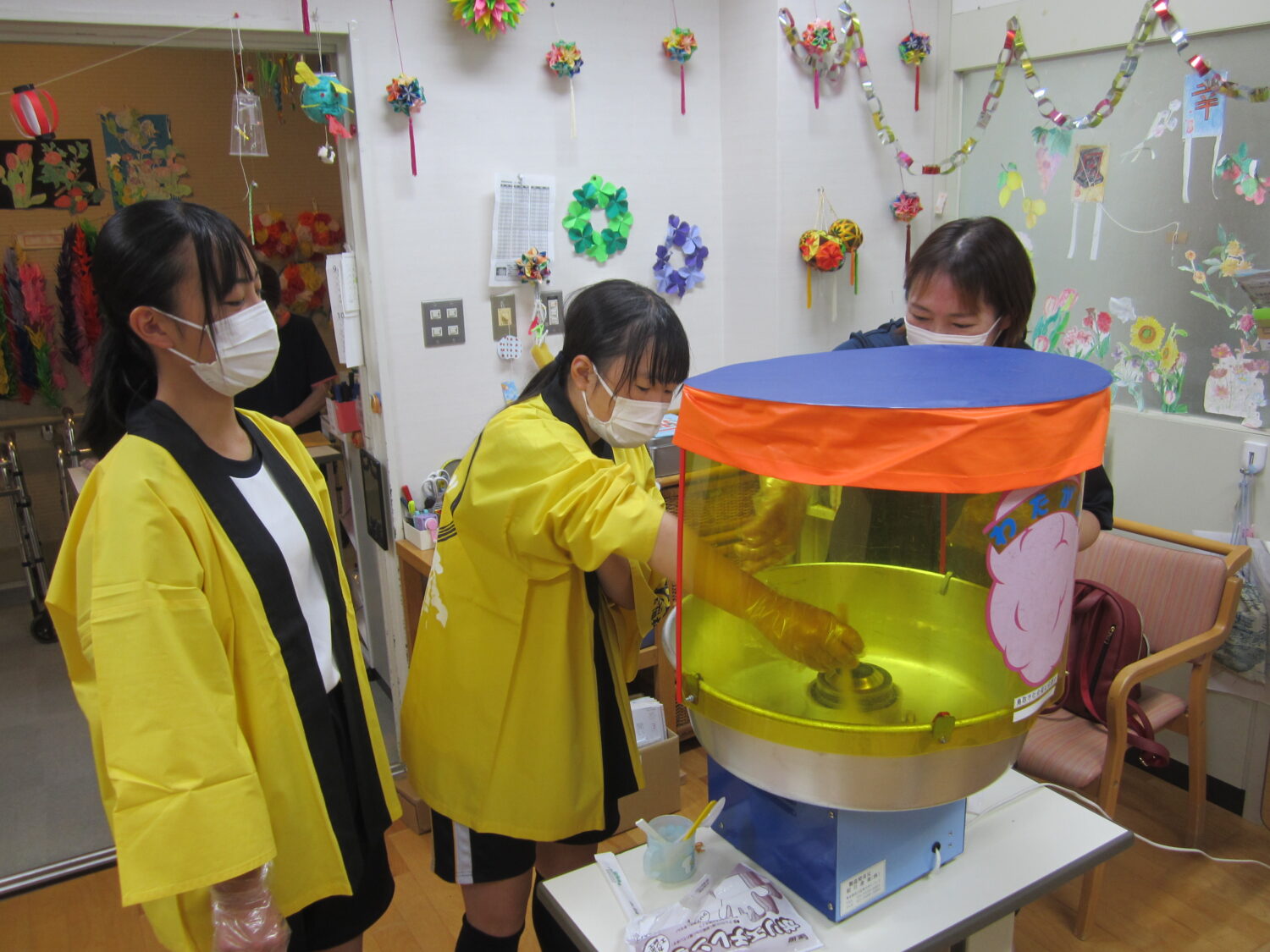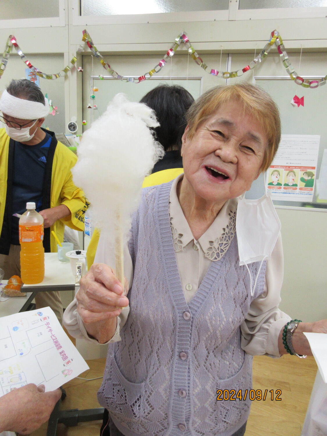 綿菓子、ドリンクバー、ヨーヨー釣り、魚つり、くじ引きいろんなブースを作って、利用者の皆さんに回ってもらいました。