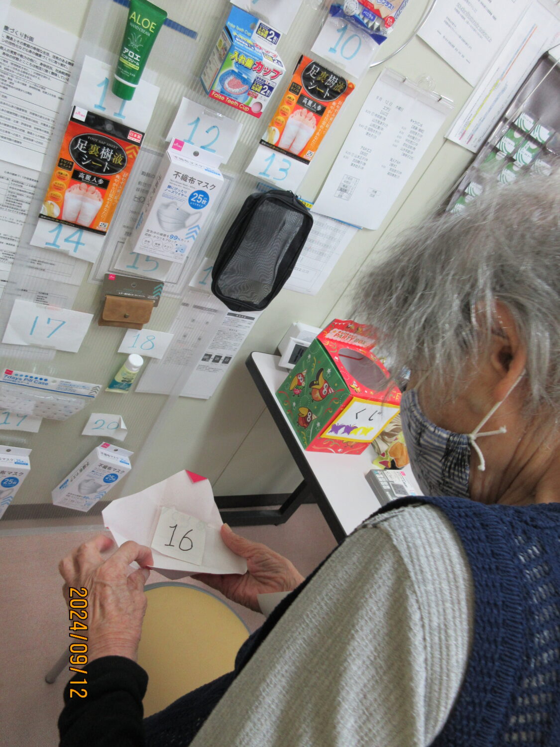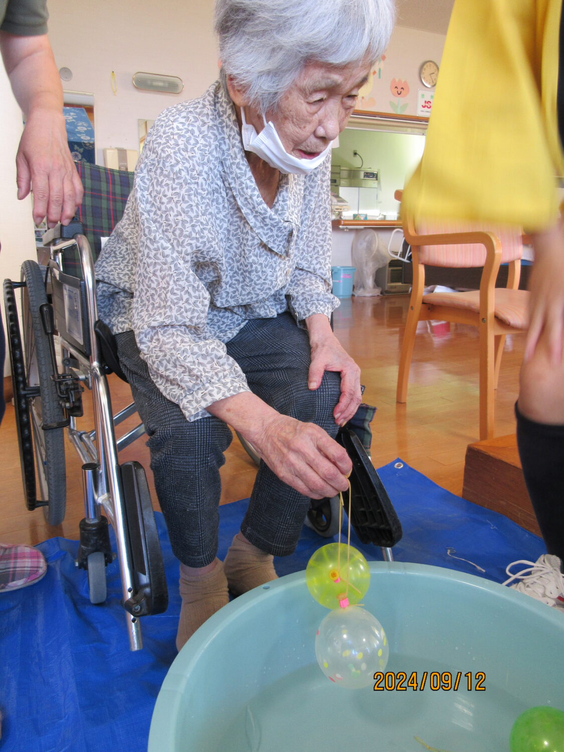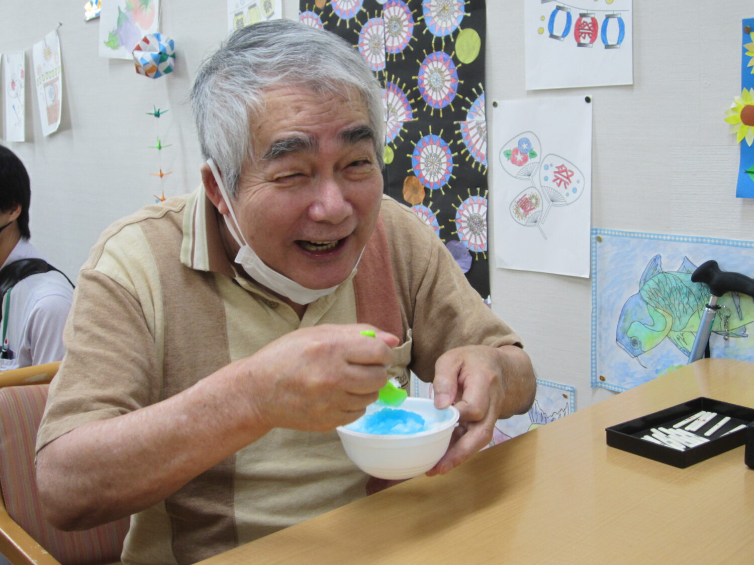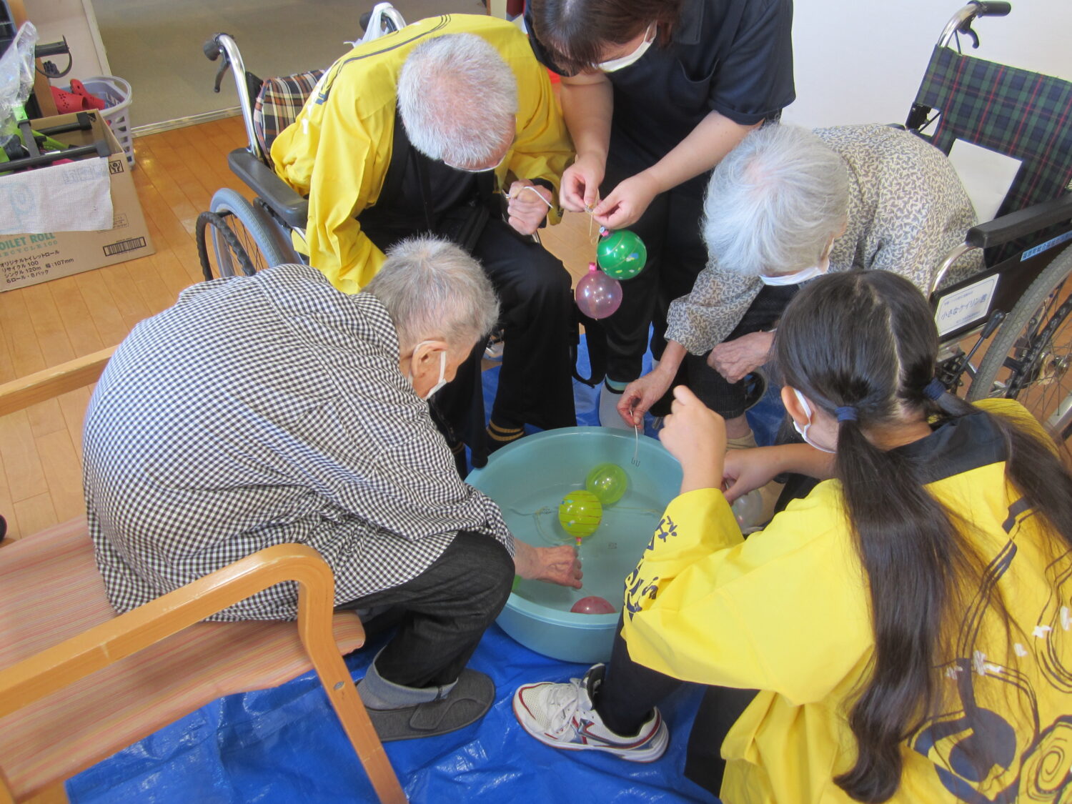 綿菓子、ドリンクバー、ヨーヨー釣り、魚つり、くじ引きいろんなブースを作って、利用者の皆さんに回ってもらいました。