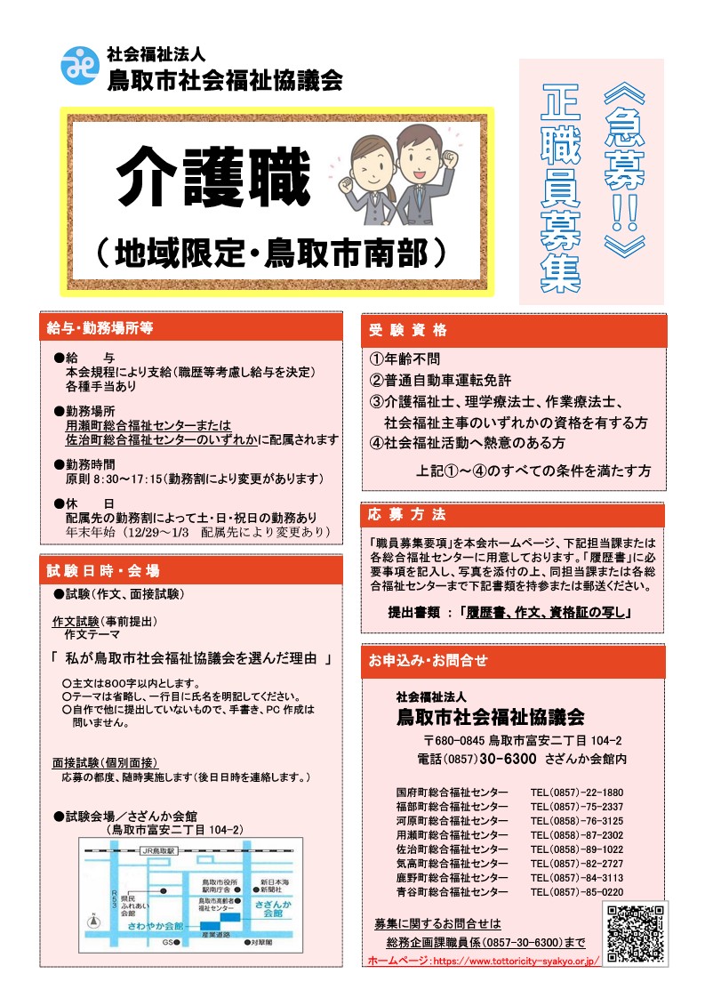 正職員(介護職 鳥取市南部地域限定採用)募集を開始します。