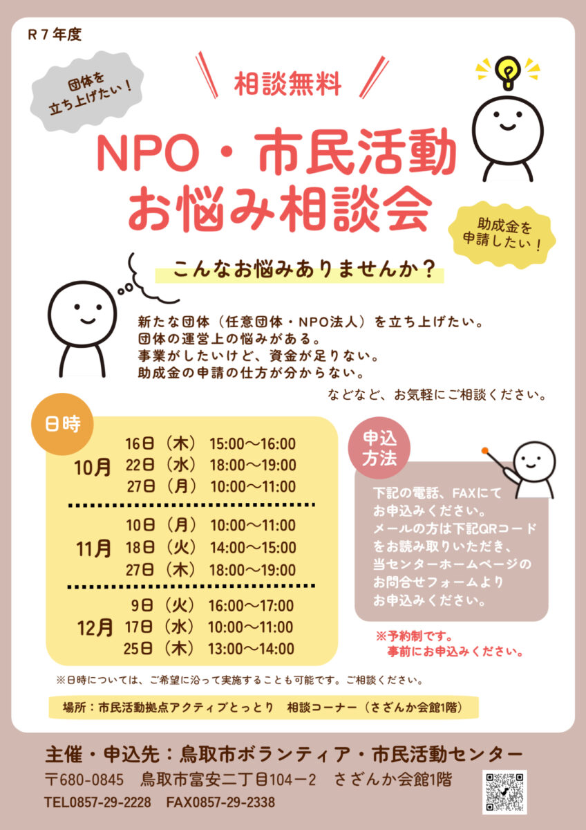 「助成金を申請したい」「団体の運営に悩んでいる」「団体をたちあげたい」「会員を増やしたい」などの、NPOや市民活動に